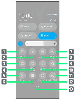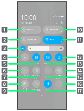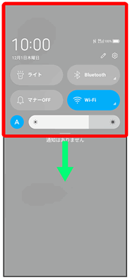 通知パネルを下にフリック/スワイプすると、クイック設定パネルを開くことができます。クイック設定パネルでは、アイコンをタップして機能のON/OFFなどを設定できます。