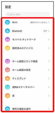 | モバイル ネットワーク | モバイルネットワーク、データ使用量など、ネットワークやインターネットに関する設定ができます。 | |