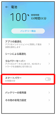| その他の省電力設定 | スマートパワーの自動起動やダークモードなどの設定ができます。 |