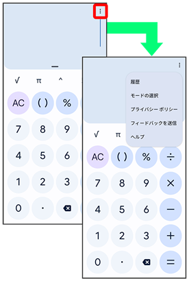 - メニューのアイコンをタップすると、その画面で利用できる機能の設定や項目が画面に表示されます。