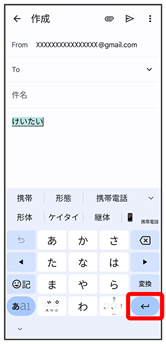 改行します。文字入力中は文字を確定します。ロングタッチするとアイコンが表示され、片手モードへの切り替えなどができます。アプリや入力欄によっては