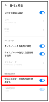 )が切り替わります。 - 言語/地域で一般的な形式を使用するがOFFの場合は、24時間表示をタップするたびに、24時間表示(