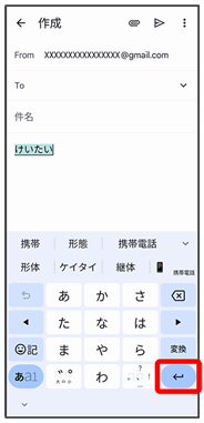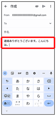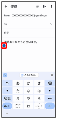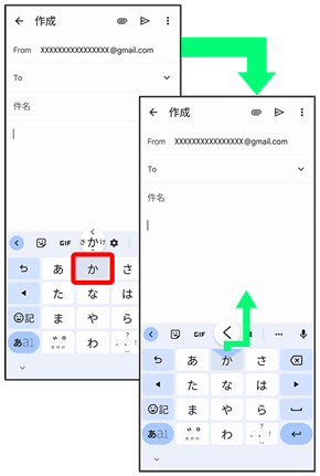 キーを上下左右にフリックすることで、キーを繰り返しタップすることなく、入力したい文字を入力できます。キーに触れると、フリック入力で入力できる候補が表示されます。入力したい文字が表示されている方向にフリックすると、文字が入力されます。