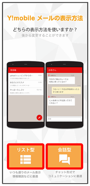 Y!mobile メールの設定中に、メールの表示方法を「会話型」と「リスト型」から選択できます。また、表示方法はあとから切り替えることができます。詳しくは、「会話型表示/リスト型表示について」を参照してください。