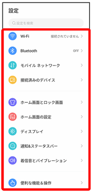 | モバイル ネットワーク | モバイルネットワーク、データ使用量など、ネットワークやインターネットに関する設定ができます。 | |
