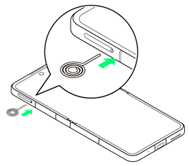 - SIM取り出しツールをトレイ取り出しホールに水平に差し込む