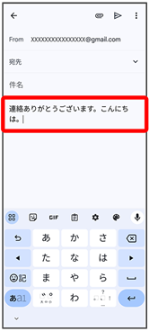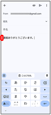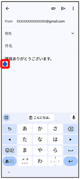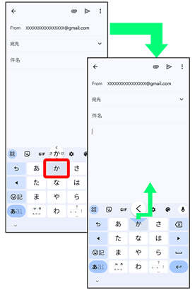 キーを上下左右にフリックすることで、キーを繰り返しタップすることなく、入力したい文字を入力できます。キーに触れると、フリック入力で入力できる候補が表示されます。入力したい文字が表示されている方向にフリックすると、文字が入力されます。