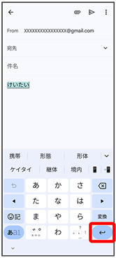 改行します。文字入力中は文字を確定します。ロングタッチするとアイコンが表示され、片手モードへの切り替えなどができます。アプリや入力欄によっては