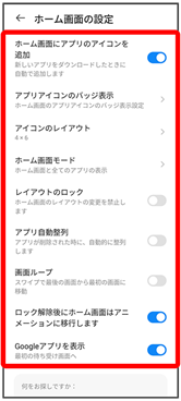 | レイアウトのロック | ホーム画面のレイアウトを固定するかどうかを設定します。 | |