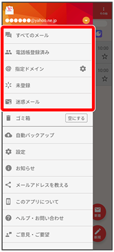 - すべてのメール/電話帳登録済み/指定ドメイン/未登録/迷惑メール