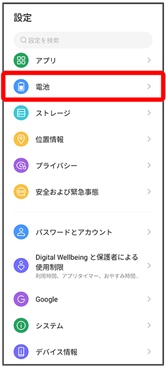 | バッテリーの使用量 | アプリや機能ごとの電池の使用量を確認します。 |