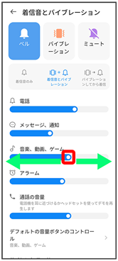| 音楽、動画、ゲーム | 音楽や動画、ゲームなどの音量を設定します。 | |