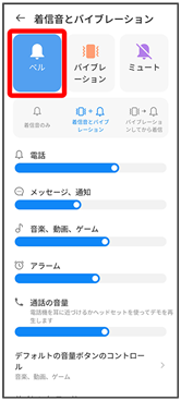 | ベル | 着信音をオンにします。着信音のみ/着信音とバイブレーション/バイブレーションしてから着信を設定します。 | |