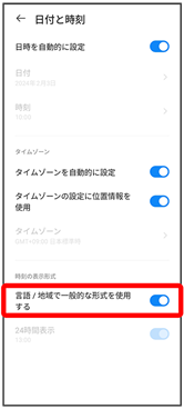 )が切り替わります。 - 言語/地域で一般的な形式を使用するがOFFの場合は、24時間表示をタップするたびに、24時間表示(