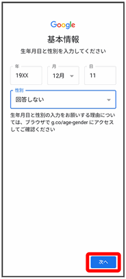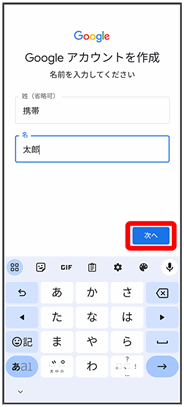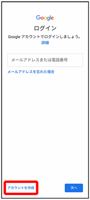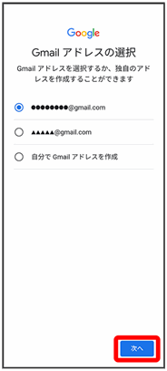 • 独自のGmail アドレスを作成する場合は、自分で Gmail アドレスを作成→「Gmail アドレスを作成」欄をタップ→独自のGmail アドレスを入力→次へをタップします。