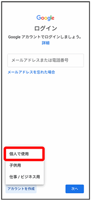 • ビジネスの管理用のアカウントを作成する場合は、仕事/ビジネス用をタップし、画面の指示に従って操作してください。