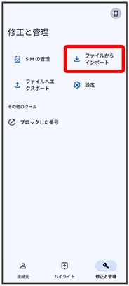 内部ストレージに保存(バックアップ)した電話帳データを読み込み(インポート)できます。