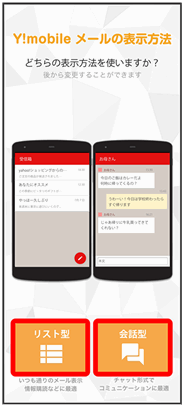 Y!mobile メールの設定中に、メールの表示方法を「会話型」と「リスト型」から選択できます。また、表示方法はあとから切り替えることができます。詳しくは、「会話型表示/リスト型表示について」を参照してください。