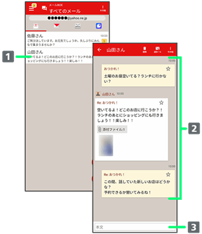 会話型表示では、宛先ごとに送受信したメールをまとめて表示します。たとえば、山本さんとやりとりしたメールを確認するときは、1つのスレッドの中で山本さんと会話をしているように表示されます。