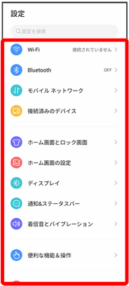 | モバイル ネットワーク | モバイルネットワーク、データ使用量など、ネットワークやインターネットに関する設定ができます。 | |