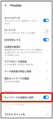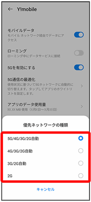 • お買い上げ時は5G/4G/3G/2G自動に設定されています。日本国内や3Gネットワークの通信事業者のみの地域で本機を使用する場合は設定を変更する必要はありません。