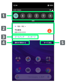 - クイック設定パネルの一部が表示されます。詳しくは、「クイック設定パネルの見かた」を参照してください。