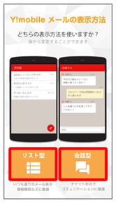 Y!mobile メールの設定中に、メールの表示方法を「会話型」と「リスト型」から選択できます。また、表示方法はあとから切り替えることができます。詳しくは、「会話型表示/リスト型表示について」を参照してください。