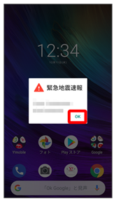 画面に「緊急地震速報」などのメッセージが表示され、緊急地震速報/災害・避難情報個別の警告音およびバイブレータでお知らせします。