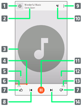 - 画面下部の再生バーを上にドラッグすると音楽再生画面が表示できます。
