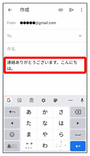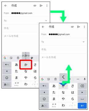 キーを上下左右にフリックすることで、キーを繰り返しタップすることなく、入力したい文字を入力できます。キーに触れると、フリック入力で入力できる候補が表示されます。入力したい文字が表示されている方向にフリックすると、文字が入力されます。