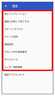 | 通話に応答して終了する | ・電源ボタンで通話を終了 電源キーを押して通話を終了できるようにするかどうかを設定します。 ・着信後バイブレーション 相手が電話を受けたときにバイブレータを動作させるかどうかを設定します。 |