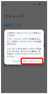 - フォーマットすると、SDカード内のデータがすべて消去されます。ほかの機器で使用したSDカードをフォーマットするときは、あらかじめよくご確認のうえ、操作してください。