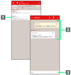 会話型表示では、宛先ごとに送受信したメールをまとめて表示します。たとえば、鈴木さんとやりとりしたメールを確認するときは、1つのスレッドの中で鈴木さんと会話をしているように表示されます。