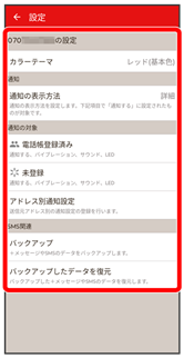 | バックアップ | +メッセージやSMSのデータをバックアップします。 | |