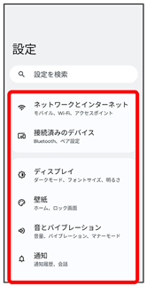 | ネットワークとインターネット | Wi-Fiやモバイルネットワーク、データ使用量など、ネットワークやインターネットに関する設定ができます。 | |