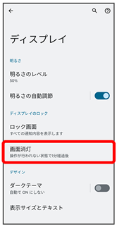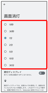 | 画面消灯 | 一定時間操作をしなかったときに、画面が自動消灯するまでの時間を設定します。 | |