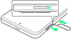 • ↓SIM取出し用ピン(試供品)をSIMおよびmicroSDカードトレイの穴に差し込む
