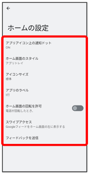 | ホーム画面のスタイル | ホーム画面のスタイルやアプリアイコンについて設定できます。 | |
