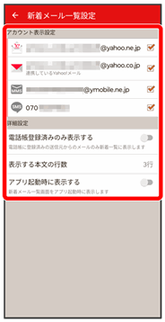 • ↓新着メール一覧設定画面でアプリ起動時に表示する