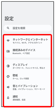 | ネットワークとインターネット | Wi-Fiやモバイルネットワーク、データ使用量など、ネットワークやインターネットに関する設定ができます。 | |