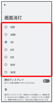 | 画面消灯 | 一定時間操作をしなかったときに、画面が自動消灯するまでの時間を設定します。 | |