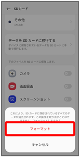 - フォーマットすると、SDカード内のデータがすべて消去されます。ほかの機器で使用したSDカードをフォーマットするときは、あらかじめよくご確認のうえ、操作してください。