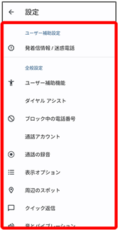 | 発着信情報/迷惑電話 | ・発信者番号とスパムの番号を表示 連絡先にない電話番号の発信者名や、迷惑電話の可能性がある着信の際に情報が表示される設定をします。 ・迷惑電話をブロック 迷惑電話の疑いがある通話をブロックします。 |