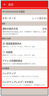 | バックアップ | +メッセージやSMSのデータをバックアップします。 | |