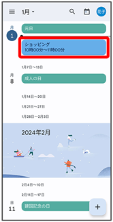 - カレンダーの表示を「月」に設定しているときは、確認する日付をタップしたあと、確認する予定をタップしてください。