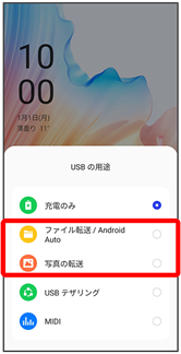 | ファイル転送/Android Auto | 本機に保存されている各種ファイル(写真、動画、音楽)を、パソコンとやりとりできます。 | |