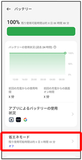 | アプリによるバッテリーの使用状況 | 過去24時間のバッテリー使用量および使用時間をアプリごとに確認できます。また、バッテリー持続時間を延ばすための設定変更ができます。 | |