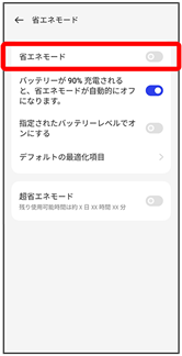 - バッテリーが90%充電されると、省エネモードが自動的にオフになります。をタップするたびに、有効(