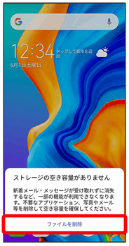 本機のメモリの空き容量が少なくなると警告メッセージが表示されます。不要なファイルやアプリ等を削除して、メモリの空き容量を確保してください。空き容量が少ない状態で使用し続けた場合、新着メール/メッセージが受け取れず消失する恐れがありますのでご注意ください。
