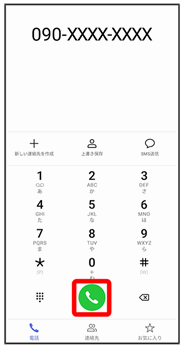 電話をかけます。また、発信履歴がある場合、電話番号未入力のときにタップすると最新の発信履歴が入力されます。